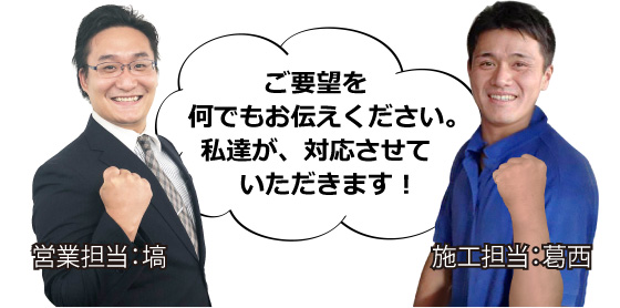 お客様より工事に関していただくご要望には、最大限お応えできるように努力しております。もちろん、時期や機種によっては、工事までにお時間をいただいたりと、すべてにお応えできるわけではございませんが、リピーター様から、施工スタッフを名指しで御指名頂いたり、タバコを吸わないスタッフにしてほしい、夜工事をしてもいいので取付を急いでほしいなど、ご要望は何なりとお伝えください。